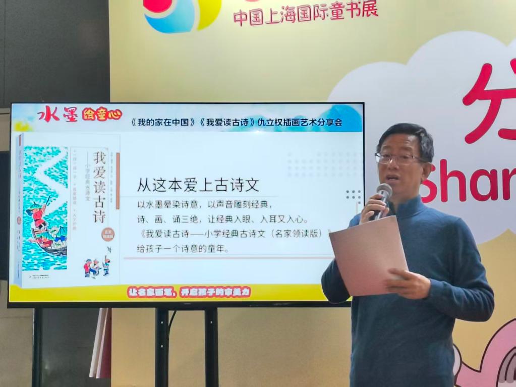 大写意插图画家仇立权毕业于中央工艺美术学院,现为中国国家画院名家工作室画家、民盟中央美术院北京分院画家、中国新闻漫画研究会会员。此番受邀参展,他带来了《我的家在中国——五十六个民族是一家》《我爱读古诗——小学经典古诗文(名家领读版)》《九色鹿》《猎人海力布》等多部儿童绘本、插画作品,并与现场观众分享创作心得。
