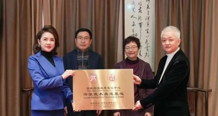 上海市台办副主任庄潜、黄浦区委常委陈颖上台见证签约。吴伟琦向台北海派武术交流中心赠送“海派武术共建基地”牌匾。