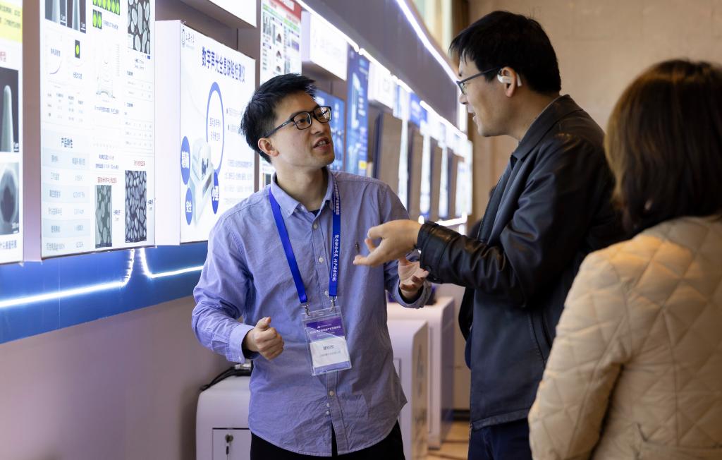 12月19日,与会嘉宾与展位工作人员(左)在原子级制造产业发展专题展上交流。