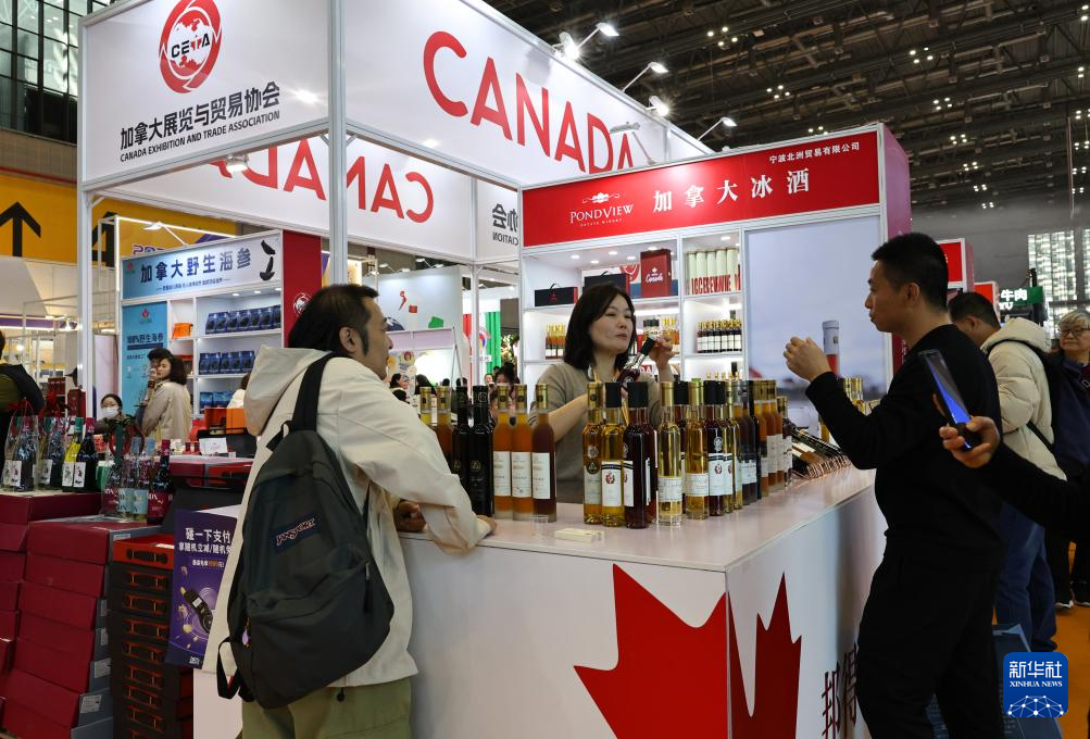 12月19日,参观者在加拿大商品展台前与工作人员交流。