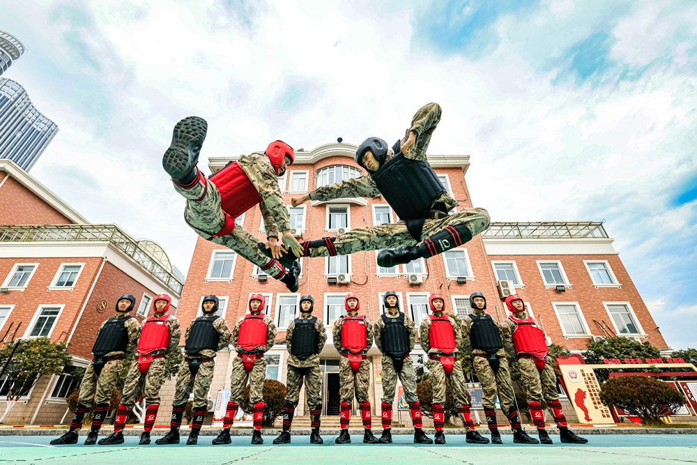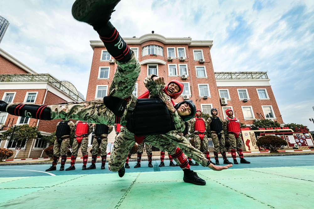 武警上海总队机动第一支队官兵正在进行擒敌术应用动作训练。新华网 发