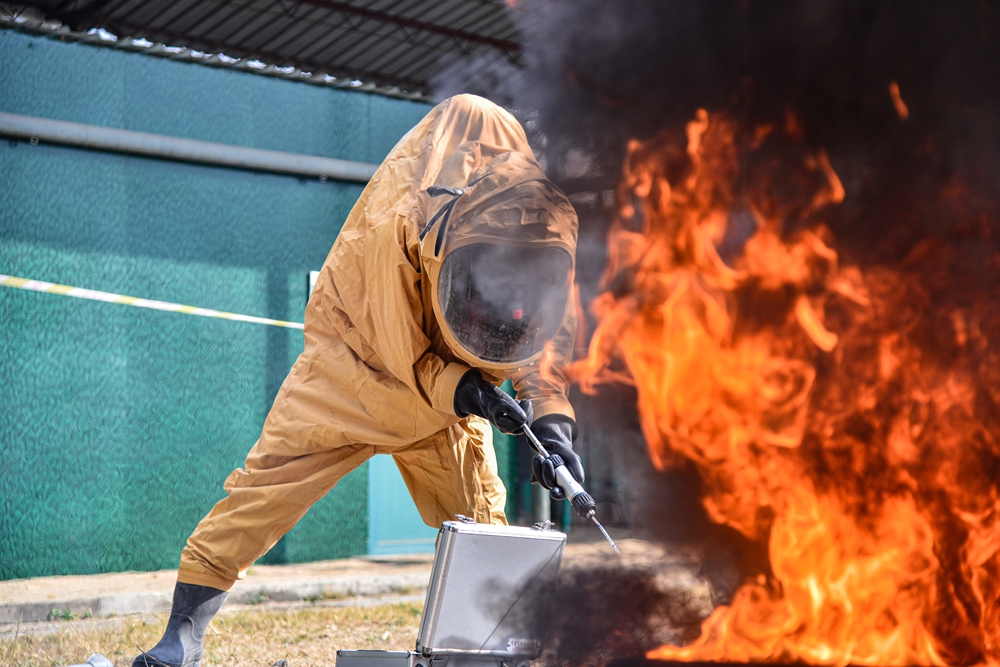 武警上海总队机动第一支队排爆手穿戴排爆服进行手工拆除爆炸物训练。新华网 发