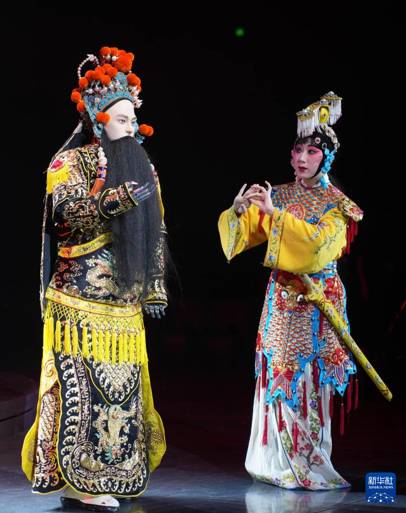 1月9日,上海戏剧学院的具身机器人“学霸01”(左)与上戏戏曲学院学生王宇晨在展演现场共演戏曲《霸王别姬》。